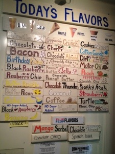 At about 8:30PM, Pat asks me if we should return to a MD creamery we had visited a couple years ago, pre-blog. I don’t remember the name which pretty much means that I don’t want to return. I reminded Pat that the flavors were lackluster. The only cool thing was that they had a huge bin for milk which they had decorated. Now that we’ve had our ice cream education, we know that the problem was too much air!