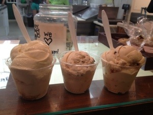 Ms. Rogers quickly chose Butter Pecan and Butter Brackle while Pat and I hesitated. First we tried Banana, Cookies and Cream, Butter Brackle, Chocolate Chip Cookie Dough, Birthday Cake Batter, then we just settled. Our golden rule is that you must purchase after trying flavors, and Butter Brackle was pretty good. Me on Butter Brackle and Chocolate Chip Cookie Dough. Him on Butter Brackle and Birthday Cake Batter.