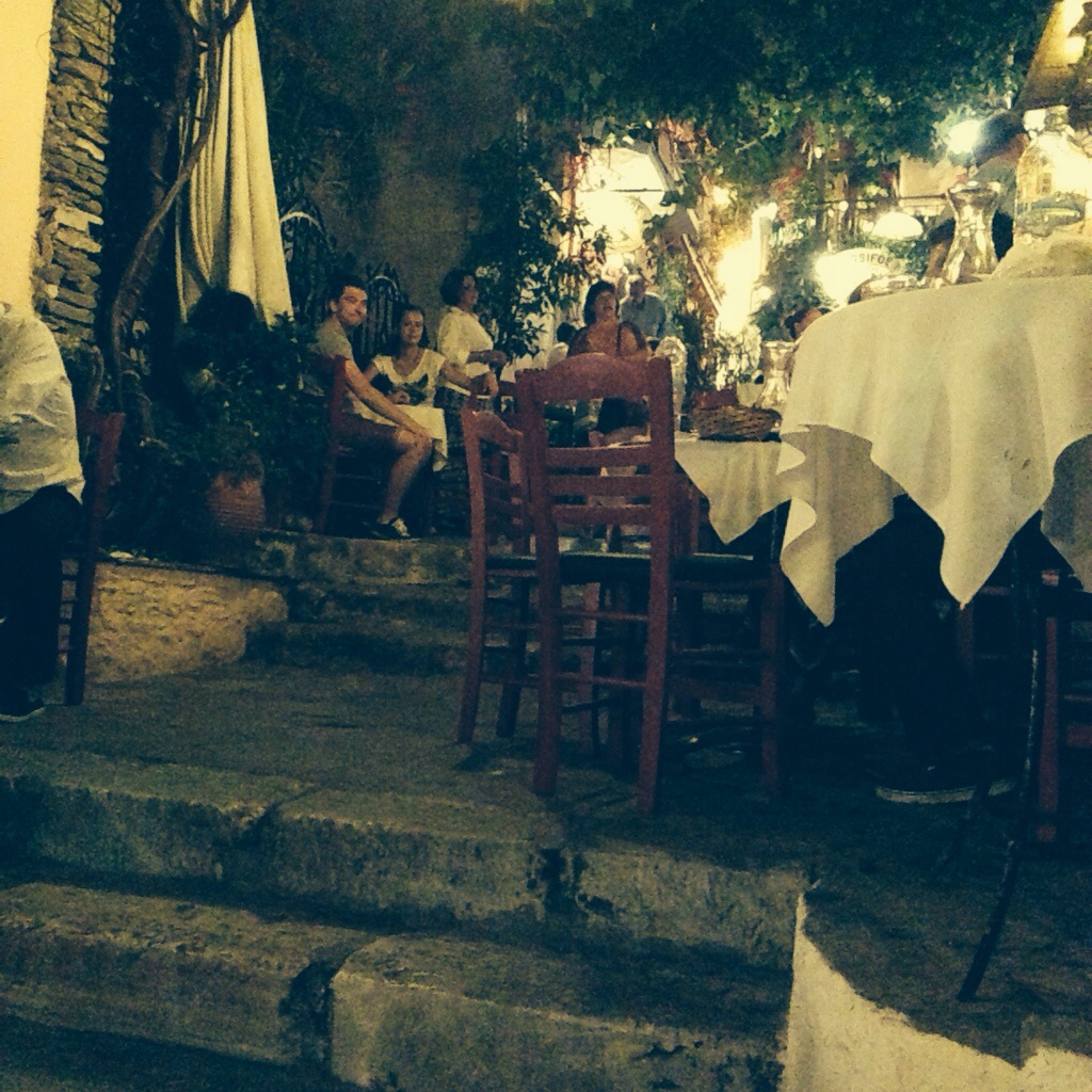 The second night’s meal was especially hilarious because we were served by the cutest little Greek grandpa. In broken English, he stood over our table and told us that he suggested we get a Greek salad plus a plate of sea bass, shrimp, and calamari for two. He did more than suggest actually. He basically stated with hand gestures and head nodding that we were going to have this meal. The only control we had was to order bread and butter. I’m not sure we needed it quite frankly. The seafood was grilled, and lemon wedges provided. This meal was meant to honor the fishy simple ingredients. Once again, I did not detect butter and/or any fat at all. The calamari was a tad rubbery, and Pat was not a fan. I ate as much as possible so as to avoid the little Grandpa yelling at me. I asked Pat if we could ask Gramps for a selfie, and he said no. Oh well. We loved the stairwell eating. Did we already say this?? The weather on a May night is low 70s with a whisper of a breeze. Not a trace of sweat on your skin. But not chilly. Some parts of Athens do not smell so sweet, but alas there is a charm. The stairs on the sides of the hill in Anafiotika lead up to the Parthenon. There is something almost historically mesmerizing about thinking about the people in 5000B.C. walking up the same steps. The restaurants are able to take advantage of the steps to create new seating. I love that Europe can be so cool without trying. We can all sit over each other smoking cigarettes and eating olives with no care in the world.