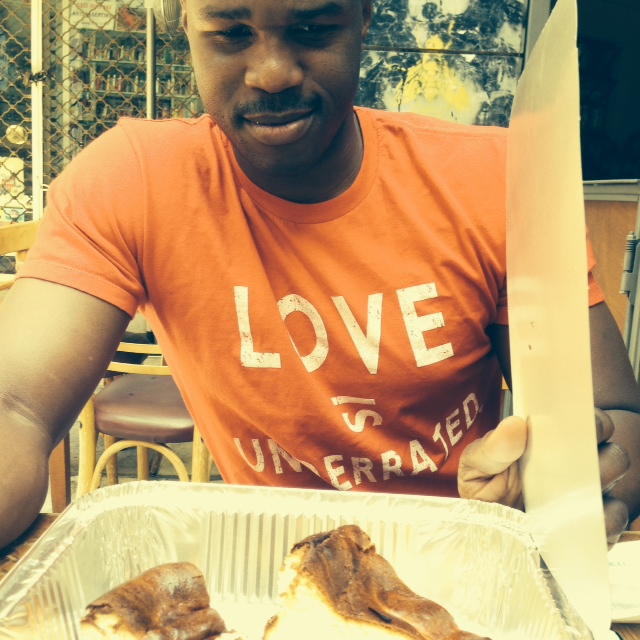 I couldn’t finish that cheesecake alone, and Pat was not helping me. We ushered our new friend over and asked him for a to-go box. He said “sure” and disappeared. He returned with a box that looked too large. And the kindness continues.