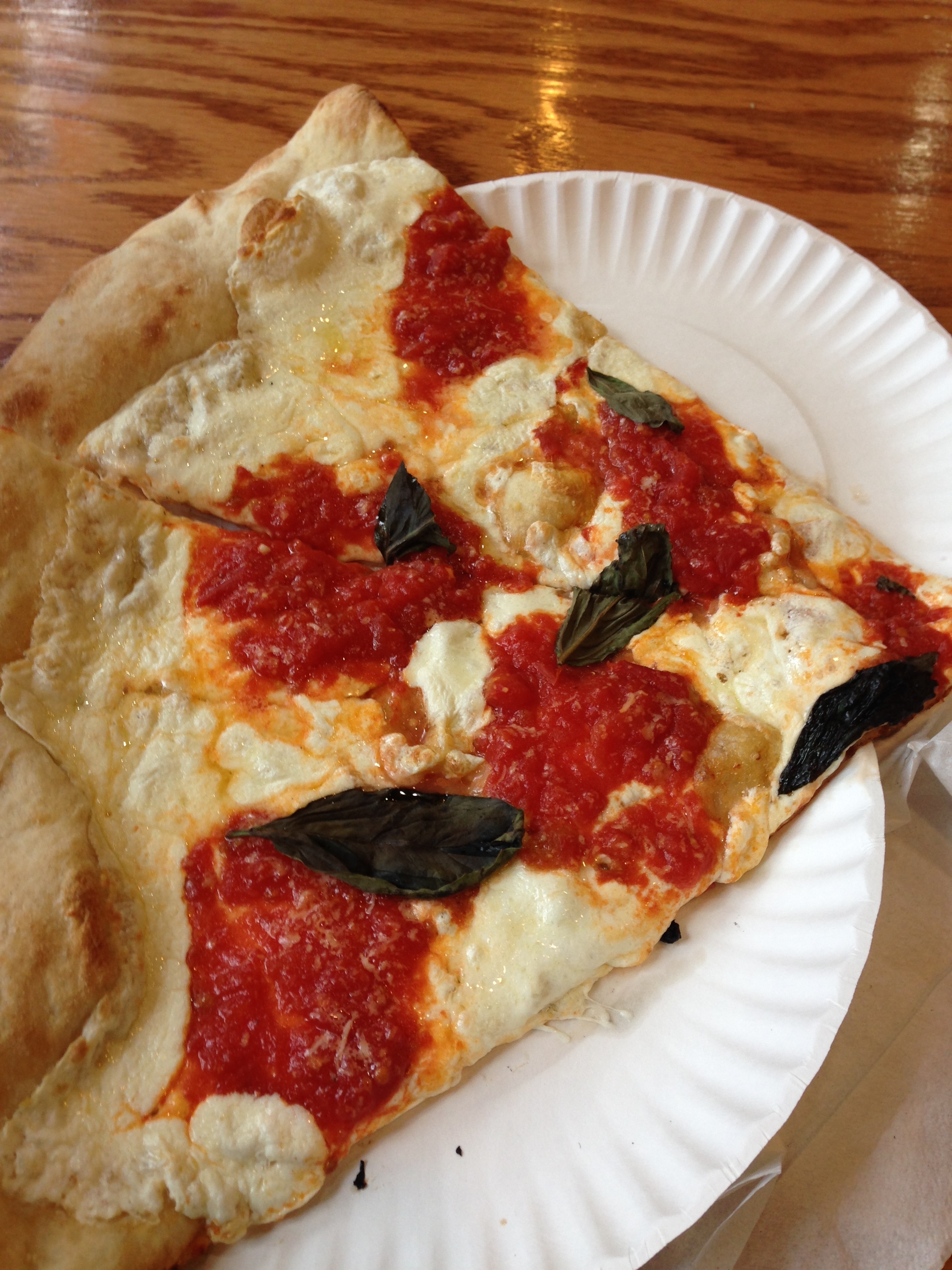 Notice the tomato juices on the plate … not grease … tomato sauce. And the crust is thin and crisp. From January 4- February 10, I had committed myself to a gluten free, dairy free, white sugar free life. It brought about amazing results – newfound energy, fresh skin, mental clarity, emotional wellbeing. I am committed to this kind of eating, but no such diet is acceptable in NY where every memory brings me to foods of my childhood. I grew up on street pizza for $1, then $1.25, probably close to $2.75 when I left nine years ago. I know Pat enjoyed the same.